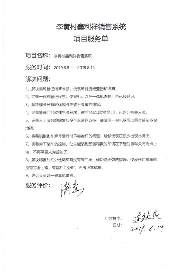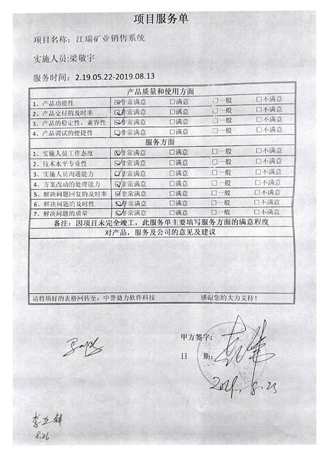 在中譽鼎力軟件科技股份有限公司,有一張“項目服務單”。這薄薄的一頁紙,記載了中譽鼎力員工去客戶現場進行智能礦山管理系統安裝、維護、售后、問題解決等各項細節;也是中譽鼎力員工精細的施工品質、完善規范的管控機制,以及追求客戶滿意的服務理念的真實寫照。