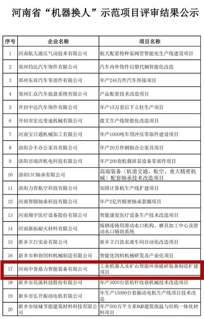 其中,河南中譽(yù)鼎力智能裝備有限公司工業(yè)機(jī)器人及礦山智能環(huán)保破碎裝備制造擴(kuò)建項(xiàng)目成功通過評(píng)審。