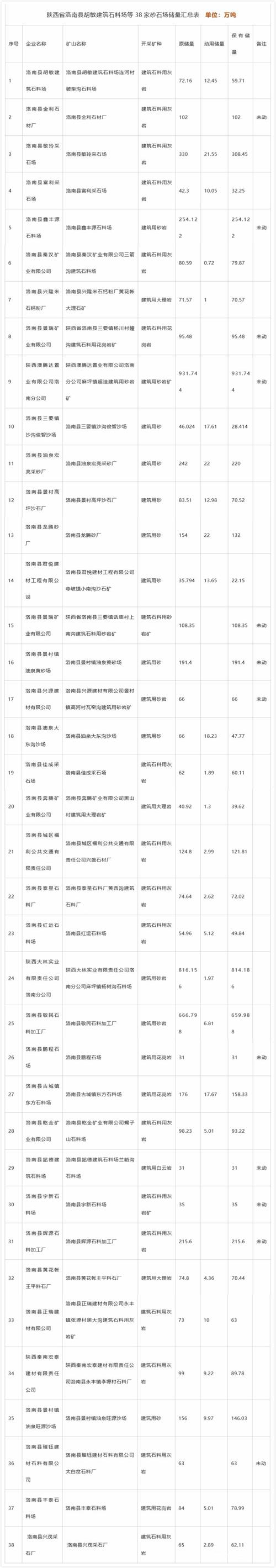 2019年9月4日,陜西省商洛市洛南縣發布《關于洛南縣礦山儲量的公示》以下簡稱(《公示》),《公示》對陜西省洛南縣胡敏建筑石料場等38家砂石場儲量匯總。