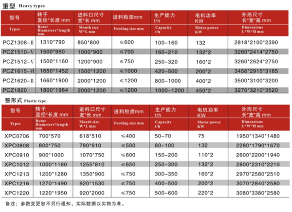 新鄉(xiāng)鼎力生產(chǎn)的pc破碎機系列采用蝸牛式上下機殼組裝結構,破碎腔闊而深,整個破碎過程無死角,結構設計合理,進入破碎腔內的物料自上而下地經(jīng)歷先粗破,再中破,后細破的破碎工藝過程,實現(xiàn)了在一個機體內同時多級連續(xù)破碎的工藝,不僅增大了破碎比,還減少了各種破碎設備和輔助設備的數(shù)量,縮小占用空間,能耗,減少投資和維護費用,可為客戶節(jié)省大量生產(chǎn)成本。客戶可根據(jù)下圖pcz重型錘式破碎機和xpc整形錘式破碎機的具體技術參數(shù)來參考并選購適合自己的設備類型。